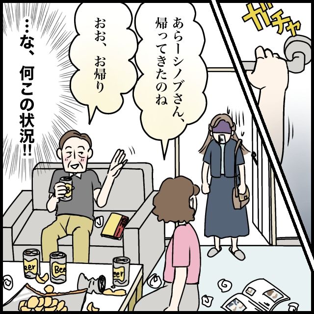 それもそのはず。リビングに入ると、食べ散らかしたビール缶やおつまみの袋が散乱して汚部屋と化した中に、義両親がくつろいでいたのです。「あら~シノブさん、帰って来たのね。」と、まるで自分の家のように言う義母と、「おぉ、お帰り」すでに酔っ払いの義父。何この状況!!私はその場に立ちスクしてしまいました。