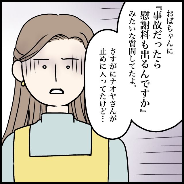 父親が亡くなってしばらくは実家で母と過ごしていた私。幼馴染のミホとミホのお母さんがサポートしてくれるのでとても有難く、優しさに涙した私です。母も「しっかりしないとお父さんに叱られちゃう」と気丈に振る舞っていました。ミホと2人になると、思い切ったようにミホが「シノブの義家族を悪く言いたくないけど」と切り出し、「おばちゃんに『事故だったら慰謝料も出るんですか』みたいな質問してたよ。さすがにナオヤさんが止めに入ってたけど・・・」と、葬儀での義父母の行動を教えてくれたのでした。葬儀に参列してすぐに慰謝料の話をしてニヤニヤしていた義両親のことを思い出し、私はまたしてもドン引きしてしまいました。