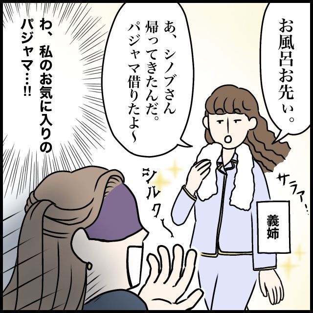 そこへ、「お風呂お先ぃ」とさっぱりした義姉までもが「あ、シノブさん帰って来たんだ。パジャマ借りたよ~」と、勝手に私のお気に入りのパジャマを着て現れたのです。