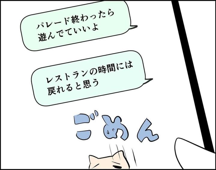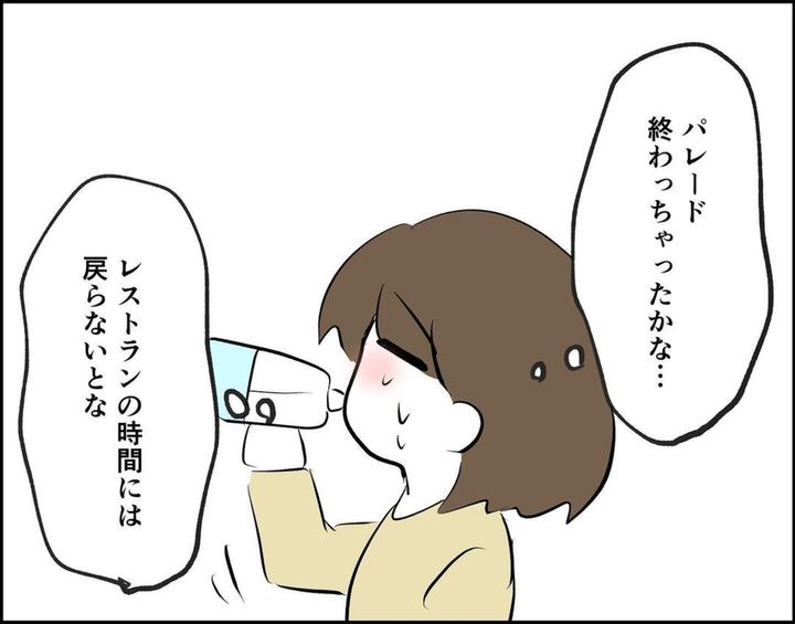徹夜明けで炎天下にいたせいか、セミさんには熱中症のような症状が出ていました。せっかく遊びに来たのに体調不良になってしまうととても悔しいですよね。しかし、パレードが始まる直前だったとはいえ、セミさんに友人2人から何の連絡も来ないところは気になります…。