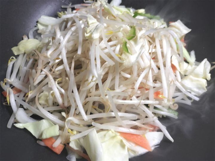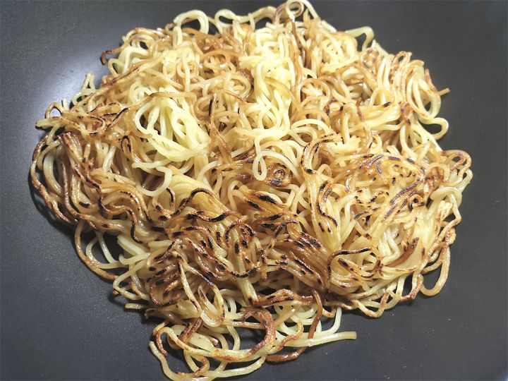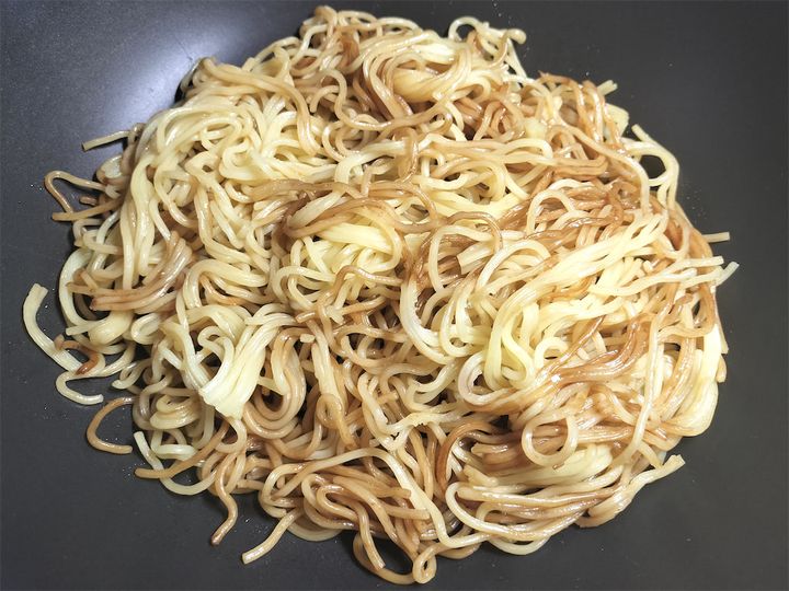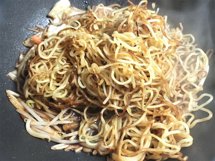 2. フライパンに蒸しあがった焼きそばを広げて入れ、強火にかけます。