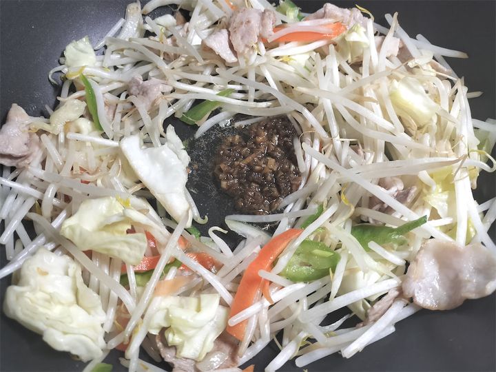 5. 豚肉から脂が出てきたら野菜を加えます。