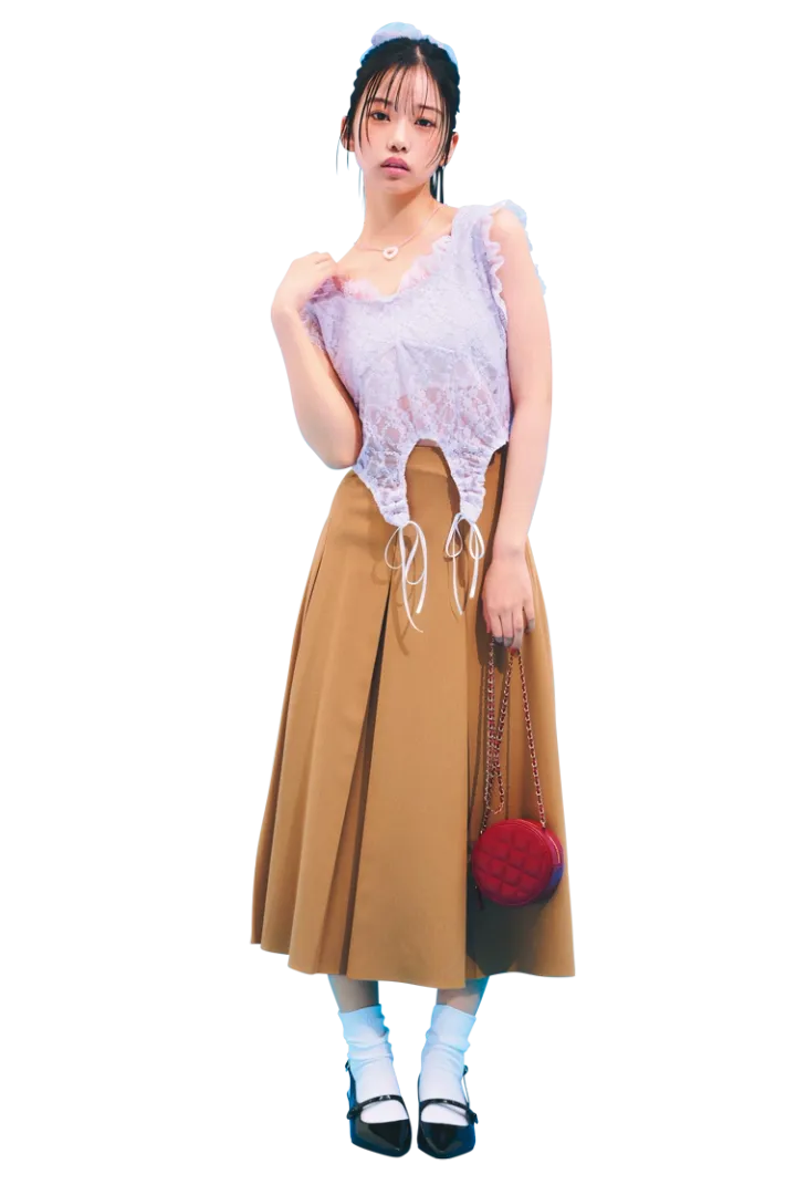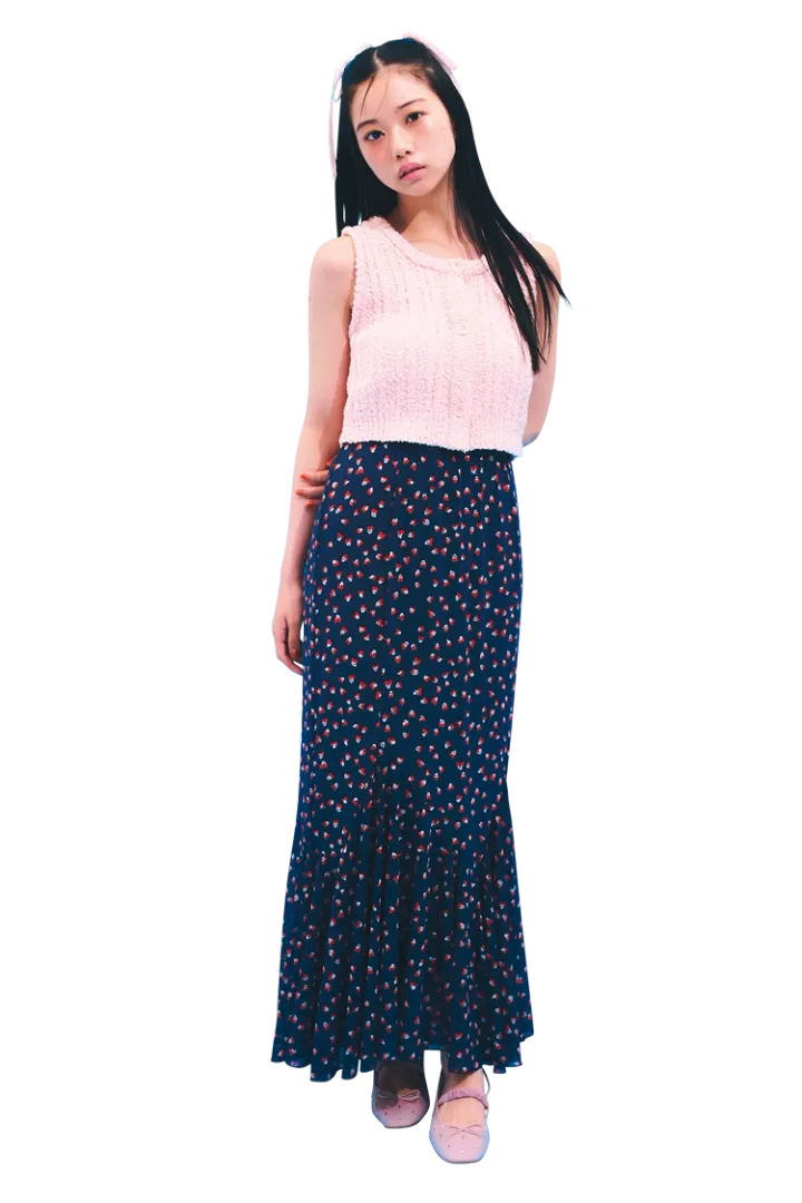 ニットベスト 3,960円/VANNIE U(アンティローザ)ハート柄マーメイドスカート 12,100円/COCO DEAL(ココ ディール)バレエシューズ 8,910円/RANDA ヘアリボン/スタイリスト私物