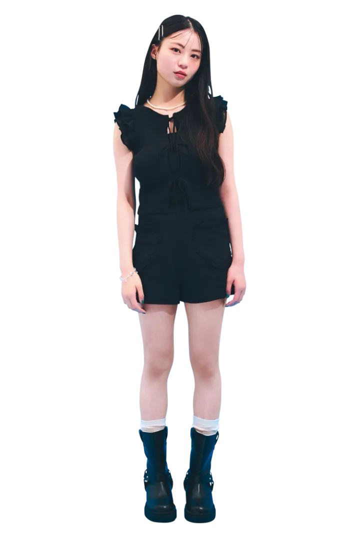 リボンニット 10,450円/COCO DEAL(ココ ディール)ショートパンツ 3,959円/PHILLY ネックレス 2,750円、ブレスレット 2,200円/ともにGOLDY レッグウォーマー 1,760円/タビオレッグラボ(Tabio)ベルトつきブーツ 5,500円/神戸レタス その他/スタイリスト私物