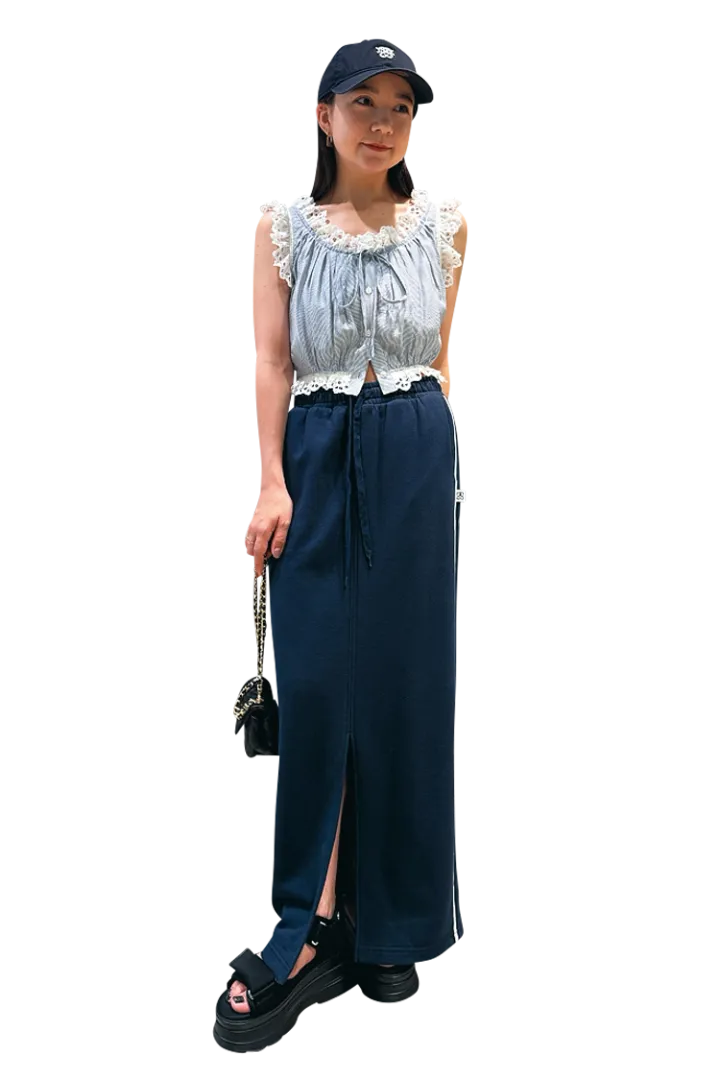 ショート丈のノースリトップスには、タイトなボトムをチョイス。