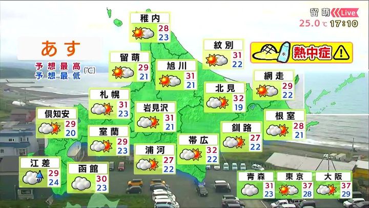 朝から日差しが強いでしょう。朝の気温は20度前後で、少しだけ寝苦しさは落ち着きますが、日中は30度前後で、稚内も28度と暑くなります。