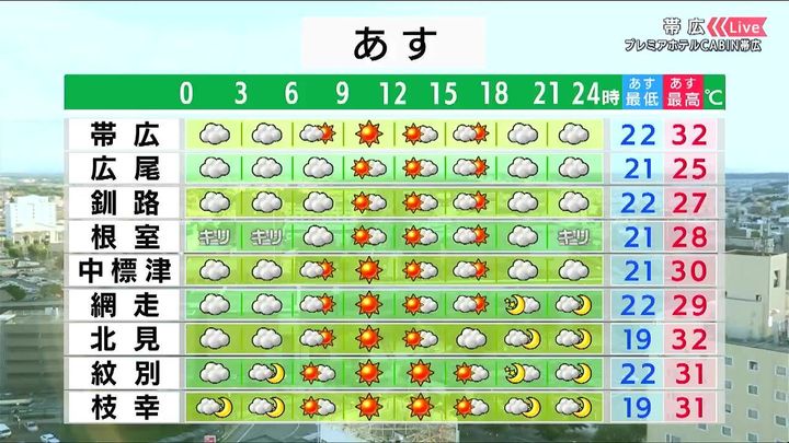 日中は広く晴れるでしょう。最低気温はけさと同じか低めですが、最高気温はきょう5日(火)と同じか高く、札幌31度、帯広、北見32度です。日ざしを避け、こまめに水分補給をしましょう。
