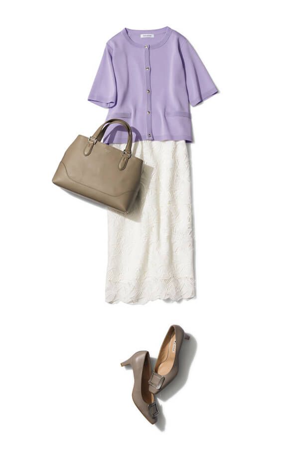 夏にも定番化したニットに、女度高めなレースペンシルで上品さを上乗せ。小物はベージュで統一して品格をキープ。