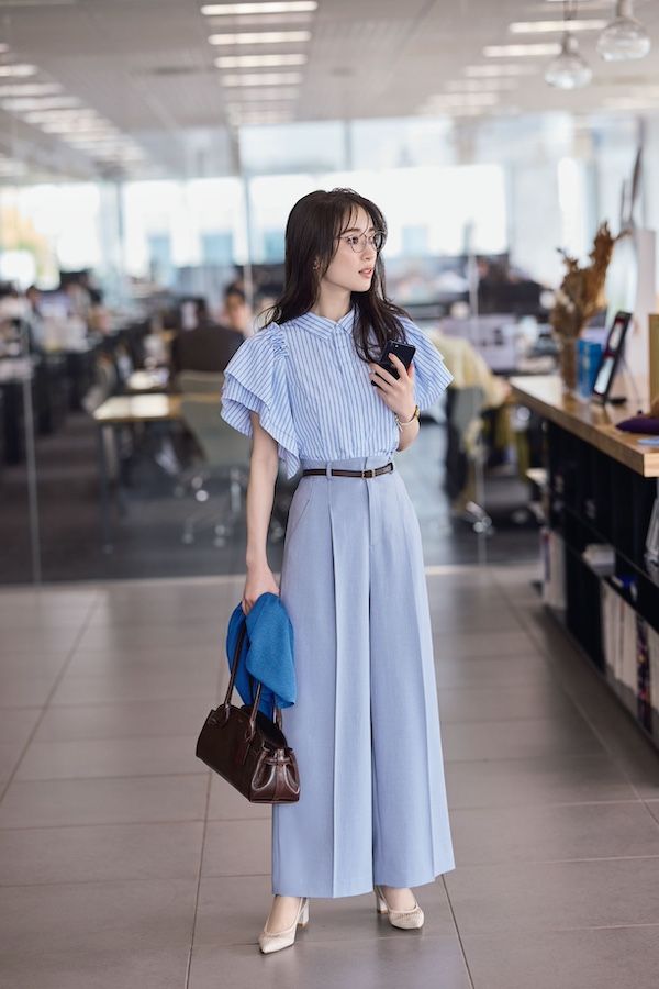 襟とストライプ柄の清潔感がオフィスで好印象