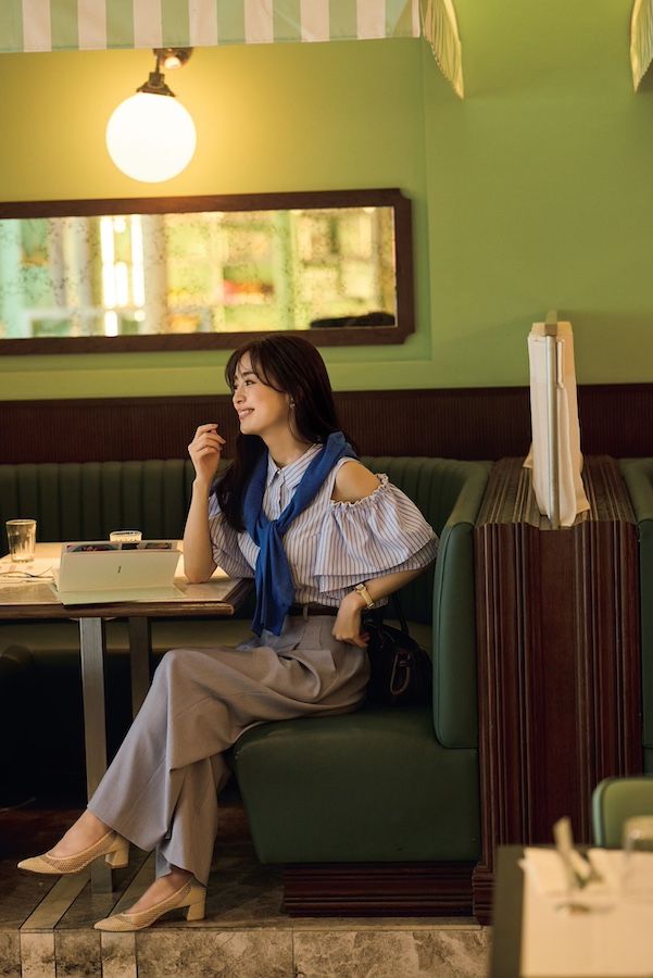 コンサバライクなルックを肩見せで旬顔にシフト