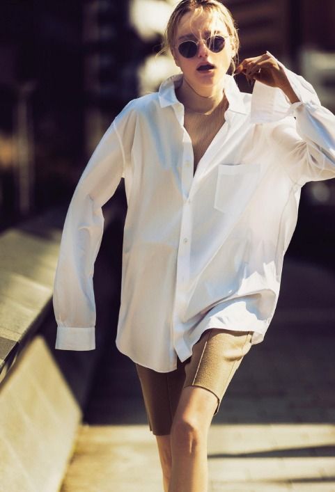 タフなスタイルにキレイをもたらすバイカーパンツ。「脚を出して上半身は肌を隠す」という均整のとれたバランスを軸に、旬のビッグシャツを投入。インナーもボトムもタイトにまとめて、シルエットにメリハリをつけたコーディネート。
