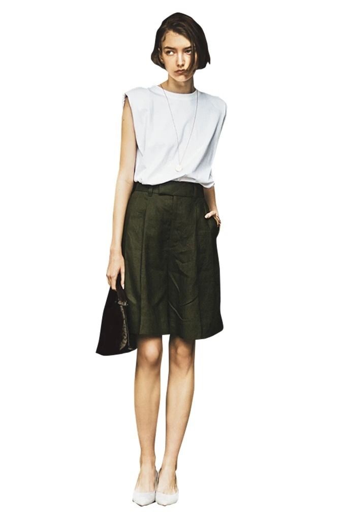 ぴったりしすぎず、適度に余裕のあるフィット感のノースリーブを合わせて。ゆるすぎないボックスシルエットのおかげで、幅広のハーフパンツともなじみいいIラインを形成できる。足元はプレーンかつ鋭いポインテッドトゥで脚線を細くアピール。