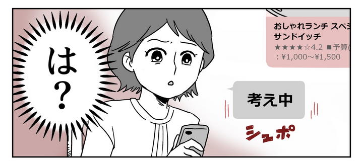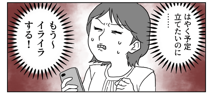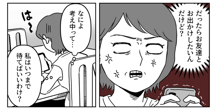 行かないのなら、私は別のお友だちを誘います。すでに「日曜日お出かけしない?」とお友達から連絡が入ったばかりです。なんで「考え中」なんて送ってくるのか。だったらいつまで考えているの? 私はいつまで待てばいいの? 腹が立ってきました。
