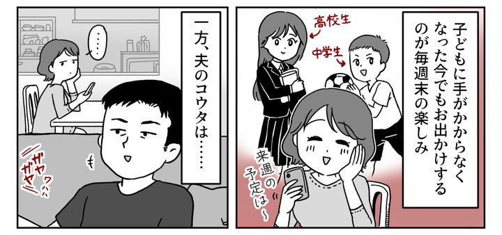 私はアリサ(40代)。今までがむしゃらに2人の子どもを育ててきました。子どもは高校生と中学生。もう親と出かける年齢ではなく、お友達と遊んだり勉強を頑張ったりしています。それまでは土日のたびに、子どもを遊びに連れて出かけていました。大人は私一人だったり、ママ友が一緒なこともありました。子どもにたくさんの思い出をつくってあげたかったからです。そして今はお出かけが趣味になりました。家にいるなんてもったいない、どこかに出かけたい! と毎週思っているのですが、夫・コウタ(40代)は……。