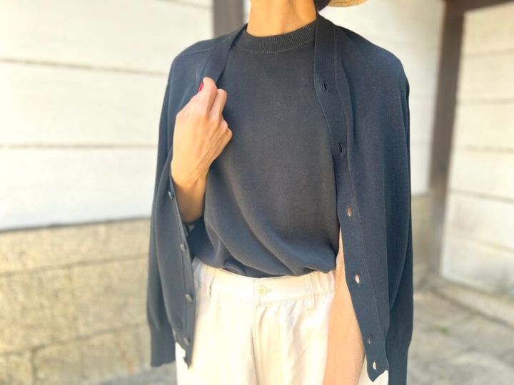 「TORICI(トリチ)は、京都出身のデザイナーさんが手がけるニットウェアブランドです。ノースリーブだけど、肌を露出しすぎないように設計された、首周り、袖周りのデザインがとても美しくて気に入っています」。これぞ夏のエレガンス。長く大切に着続けたいと思える定番中の定番です。