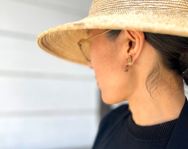 ピアスは、陶に金彩を施した「yofune(ヨフネ)」。「大阪を拠点に活動されている陶作家・西野詩織さんの装身具での活動名です。サーカスに出てきそうな、小さな猫。さりげないけど、アートピースを身につけている感覚ですね」。