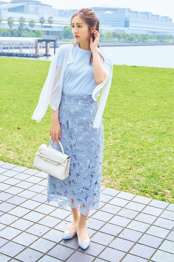 シアーカーデを重ねて王道ワントーンをブラッシュアップ。主役級のリボンレーススカートをブルーのワントーンで上品にまとめて。