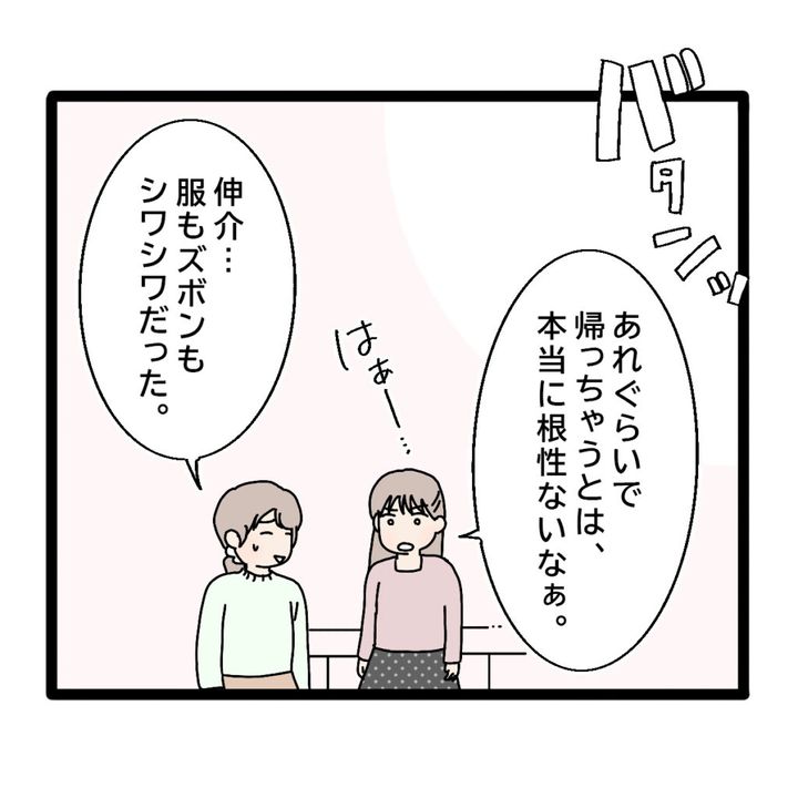 伸介が出て行った後、「はぁー・・あれぐらいで帰っちゃうとは、本当に根性ないなぁ」と言うお姉ちゃんに、「伸介・・服もズボンもシワシワだった」と呟く私。