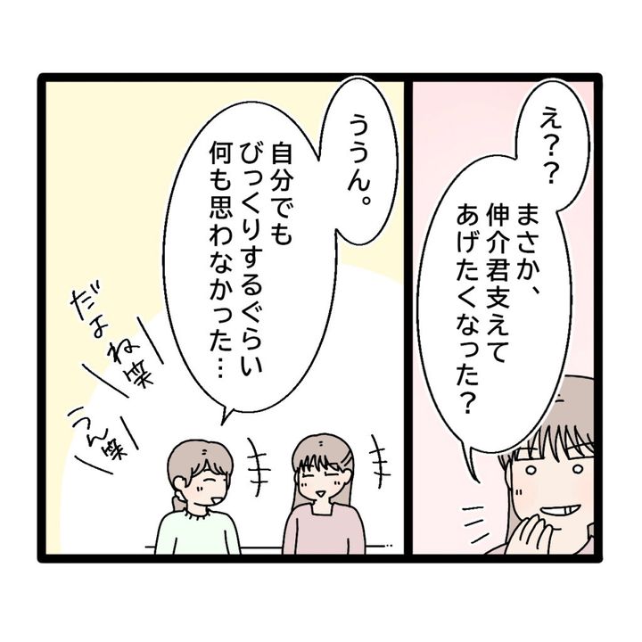 それを聞いて、「え??まさか、伸介くん支えてあげたくなった?」お姉ちゃんに、茶化すように言われて、「ううん。自分でもびっくりするぐらい何も思わなかった」と答えると、「だよね(笑)」「うん(笑)」と2人で笑い合いました。