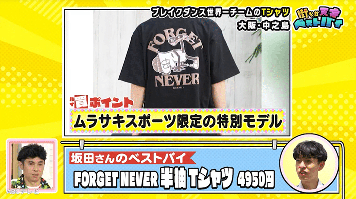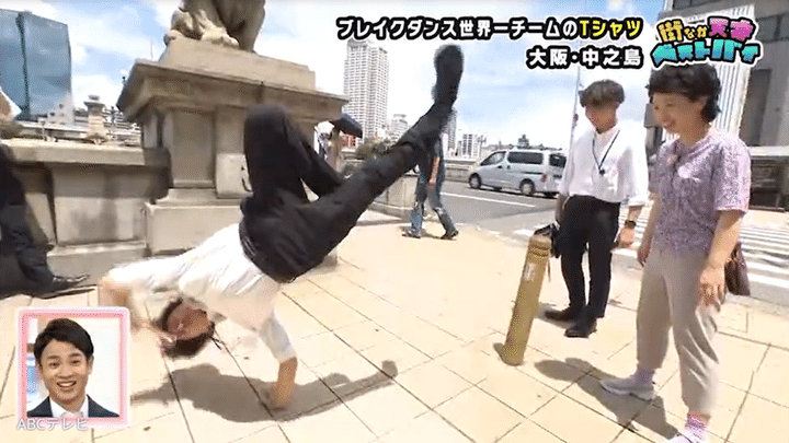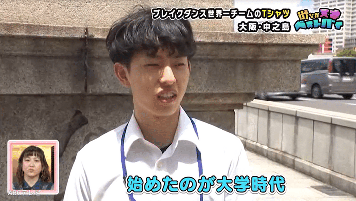天才ピアニストが最後に出会ったのは、難波橋付近にいた、ランチ休憩中の男性3人組。その中の1人は、「大学のサークルに入って初めてやり始めた」というダンスを社会人になった今も続けており、今年で5年目になるのだとか。彼のベストバイは、ブレイクダンスの大会で世界一になったチームがプロデュースしているTシャツです。