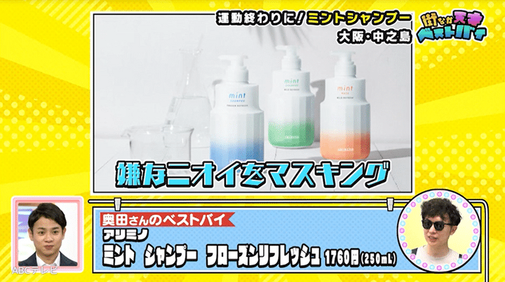 夫婦で大阪旅行中の男性のベストバイは、美容師の妻もおすすめするアリミノのミント入りシャンプー。頭皮臭、加齢臭、タバコ臭などをマスキングする成分が配合されていて、人気でリピーターも多いそうです。