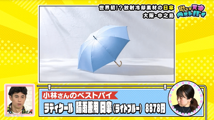 女性がおすすめする日傘は、世界初の放射冷却素材・Radi-Cool(ラディ クール)が採用されており、炎天下でも日陰のような涼しさを感じられるのだとか。彼女が購入した日傘は8878円。晴雨兼用とはいえ、日傘にしては少々高価格と思う人はいるかもしれませんが、「夏長いですし、日割りすれば(お得)」と、女性は力説しました。