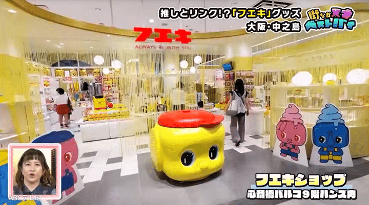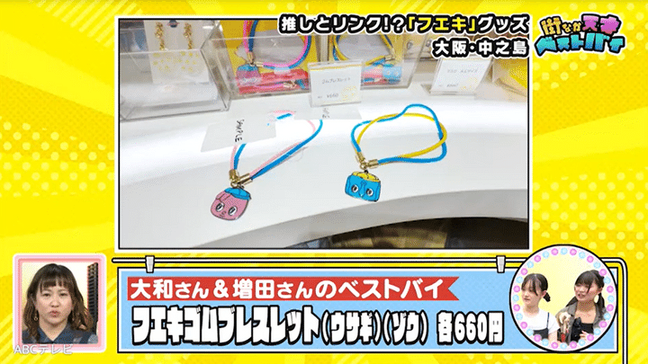 女性たちのベストバイは、大阪府八尾市に本社を構える文具メーカー・不易糊工業のキャラクター・フエキくんのブレスレット。心斎橋PARCO9階ハンズ内にある、日本唯一のアンテナショップ・フエキショップで販売しています。ブレスレットの色は、なんと彼女たちの推しのメンバーカラー! しかも、組み合わせは2種しかないため、この奇跡に女性たちは、「最高や~ん!」「これやば~い!」と大喜びしたそうです。