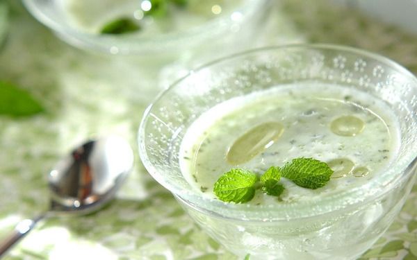 すりおろしキュウリとミントで作った冷製スープは清涼感があり、暑い日にイチオシです。プレーンヨーグルトの酸味とみずみずしいキュウリがベストマッチ。材料を混ぜて冷やすだけで、火を使わずに作れるのもうれしいところです。