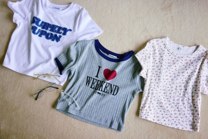 右から:リラクシーな小花柄Tはボーホーシックなムードに一目惚れ。Tシャツ¥1,290/ジーユー、スポーティなトリムTも「♡」でガーリーな要素をイン。Tシャツ¥2,969/ダブルシー、デニムディテールのフロントロゴでテンション爆上げ! ボトムもデニムでリンクさせて。Tシャツ¥2,750/スピンズ