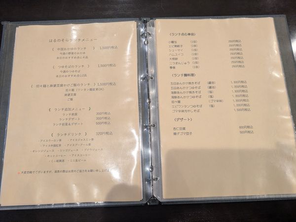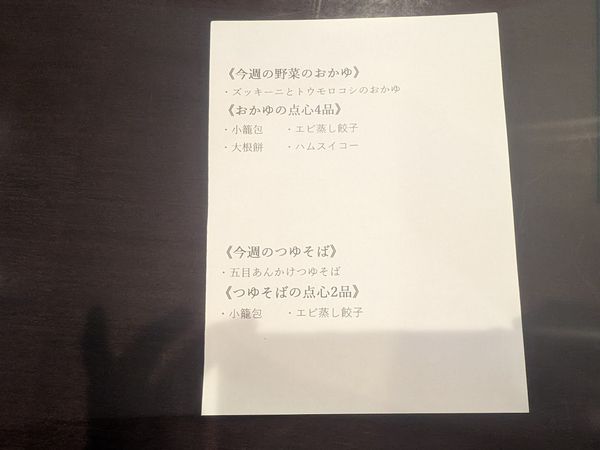 ランチは『中国おかゆのランチ』『つゆそばのランチ』の2種類あります。ランチのおかゆやつゆそばは毎週具材が変わるようです。もちろん通常メニューから選ぶこともできますよ。