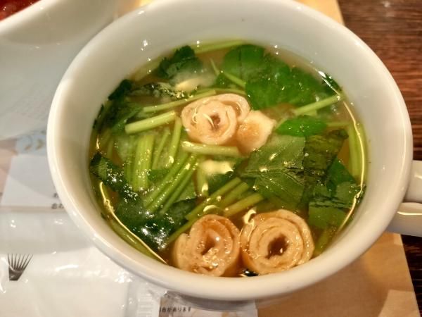 セットのスープも優しい味わいで、お麩がたっぷり♪ 三つ葉の香りがふわっと広がって、心に染み渡る美味しさでした!