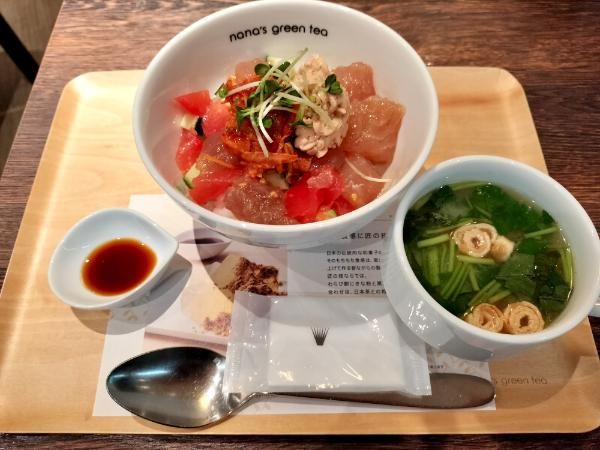 運ばれてきたお料理を前に、つい口元が緩んでしまいます♪ 単品として注文しましたが、汁物もついているのは嬉しすぎました! (ランチセットは11:00~14:30の時間帯で注文可能です) どんぶりに光る色とりどりな食材たち! うーん美味しそう!