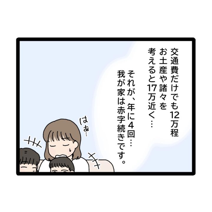 私は思わずため息が出てしまいました。なぜなら交通費だけでも12万円ほどかかり、お土産や諸々を考えると合計17万円近く。それが毎年4回。我が家は赤字続きなのです。