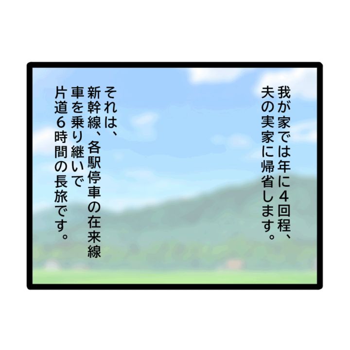 私は4歳ユイと2歳ヨウ2児の母。我が家では年に4回程、夫ひできの実家に帰省するのですが、義実家は新幹線と各駅停車の在来線、更に車を乗り継いで片道6時間の長旅です。