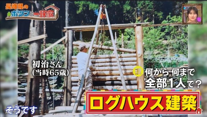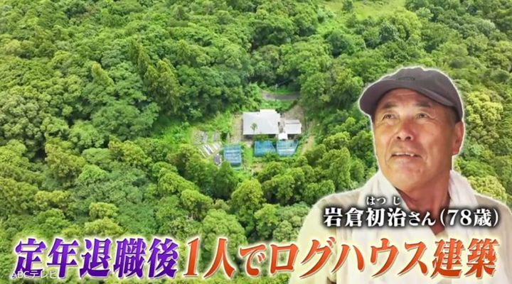 ポツンと一軒家の主は、麓の集落に住む78歳の男性。寄棟屋根の大きなログハウスは畑を併設した別荘で、土木建築に従事していた男性が定年退職を機に、すべて一人で手作りしたという。