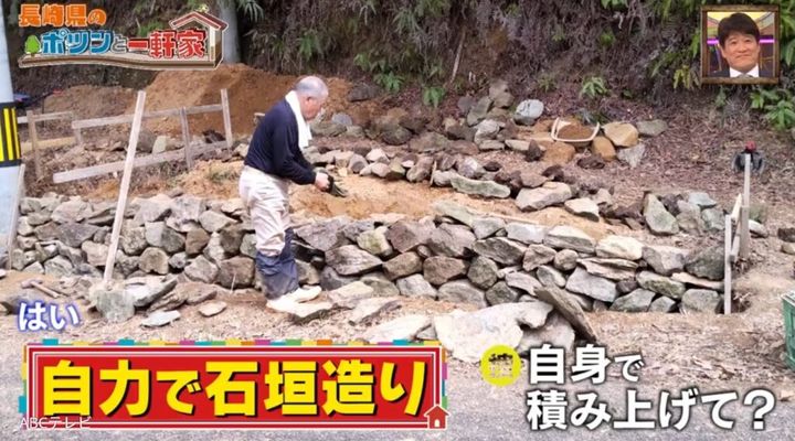 妻が亡くなり退職を迎えた後、男性はたった一人でログハウスを建て始めた。生家は41年前の大型台風で崩壊。そのまま放置されて薮になっていた場所を開墾し、敷地の杉の木を伐採し、2年かけて乾燥させて丸太にした。石垣も山の石を集めて一人で積んだ。ログハウス建設のために、男性の要望を設計士の息子が図面に起こしてくれたのだそう。