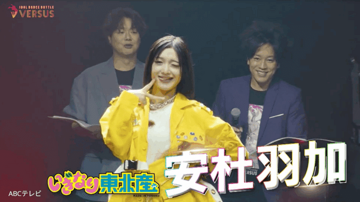 後攻は、“ダンスキラーギャル”こと安杜だ。登場から安杜は、特攻服のような衣装を一瞬だけ大胆にはだけさせ、中のノースリーブをチラ見せして観客の視線を独占! その後も、ボブヘアを振り乱して色っぽく踊り、妖艶な表情でタバコを吸うような仕草をしてみせ、観客たちをトリコに。ラストはチームメイトたちと一緒に、ダンスバトルのMCを務めるシュウペイ(ぺこぱ)のお馴染みのポーズを披露し、フロアを沸かせた。