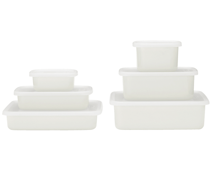 浅型、深型など形も多種あり用途によって選べる。純白の見た目の清潔感もたまらない。ホーロー保存容器各¥890~、シール蓋各¥190~(全て無印良品 銀座)