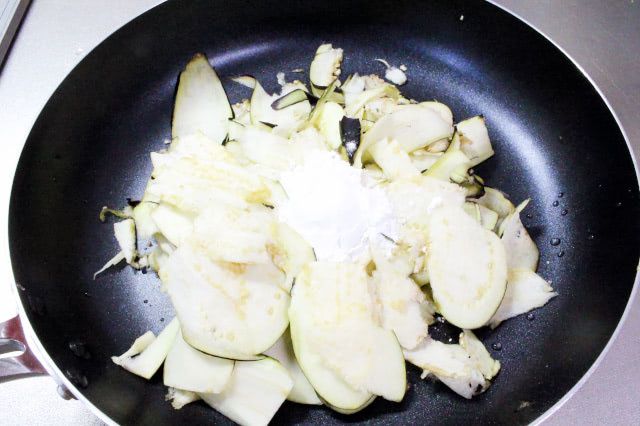 2. ピーラーでなすを薄切りにしてフライパンに入れ、片栗粉をまぶします。