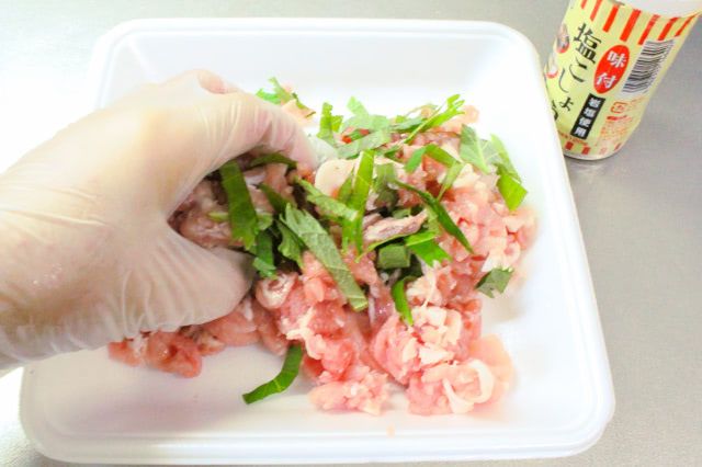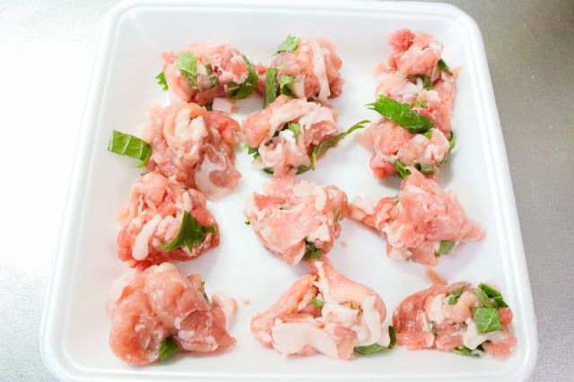 1. 青じそをキッチンばさみで千切りに、豚肉をキッチンばさみで細かく切り、塩、こしょうと酒を振りかけてから青じそを混ぜ、12等分してゆるくまとめます。