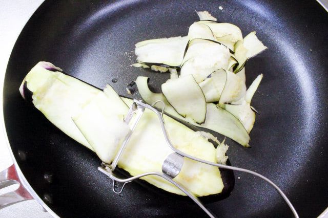 包丁でへたを取り除いたなすをピーラーで薄切りにするのがポイントです。なすの中心部ほど途中で千切れてしまい、短い薄切りがたくさん出来てしまいました。