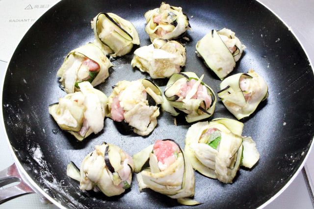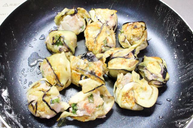 丸めた豚肉になすをくっつけ、軽く握って成形。千切れてしまったなすでも、豚肉になんとなく張り付きました。片栗粉をまぶしているので、蒸し焼きにすると蒸気で密着するでしょう。