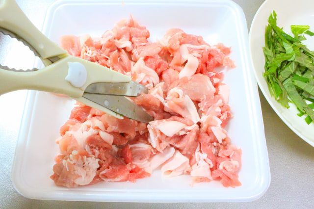 「ナス焼売」は洗い物を極力減らせる工夫もされています。キッチンばさみで青じそを千切りにしてからパックの中で豚肉を切ると、包丁とまな板を使わずに済みました。