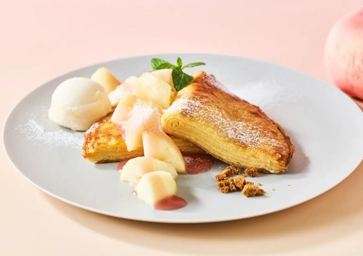 ハイティー開催期間中は、パンケーキの上に桃ソースや果肉、白桃シャーベットが乗った限定のピーチパンケーキもあるので、ぜひチェックしてみて。フレッシュピーチのミルフィーユパンケーキ¥2,600