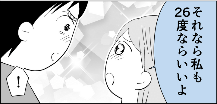 「温度を上げても寝られるように練習中なんだ!」というヒビキ。私はなにも改善しようとしなかったのに……ヒビキは私と一緒に寝室で寝るために努力してくれていたのです。ヒビキの歩み寄ろうとする気持ちが嬉しくて、それならば私も!と「それなら……26度にしてもいいよ」