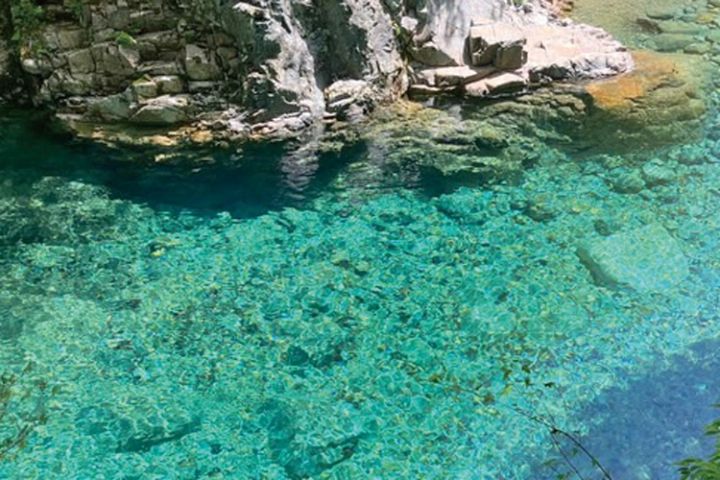 全長約15km。「阿寺ブルー」とも呼ばれる、エメラルドグリーンの美しい清流。浅瀬に感じるほどの透明度に驚くこと間違いなし。
