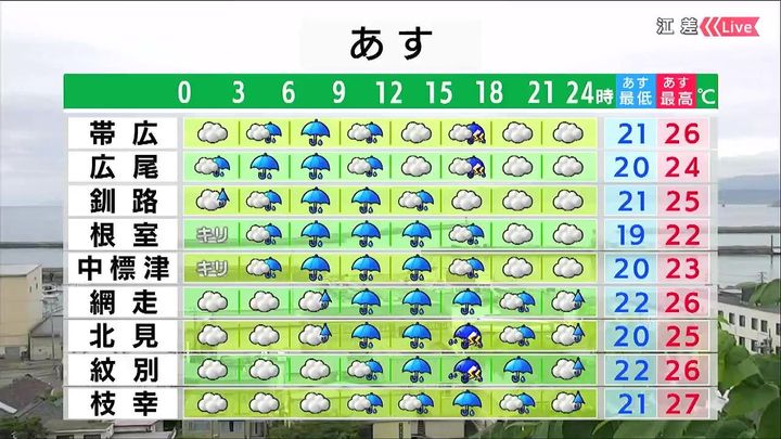 道東は昼頃まで激しい雨が降り、十勝は夕方も雷雨になるでしょう。昨日の大雨で地盤が緩んでいるおそれがあるため、土砂災害にも注意が必要です。オホーツク海側は午後を中心に大雨になるおそれがあります。