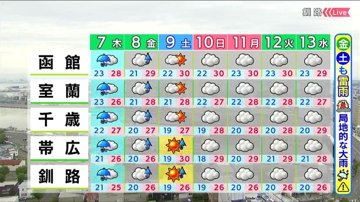 金曜は午後を中心に天気が急変し、雷雨となるでしょう。土曜も道東で雨の降る時間がありそうです。ムシムシしますが連休中、最低気温は20度を下回る地点が多く、夜の寝苦しさは少し解消します。