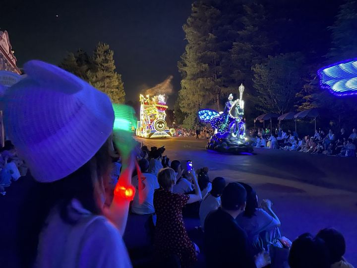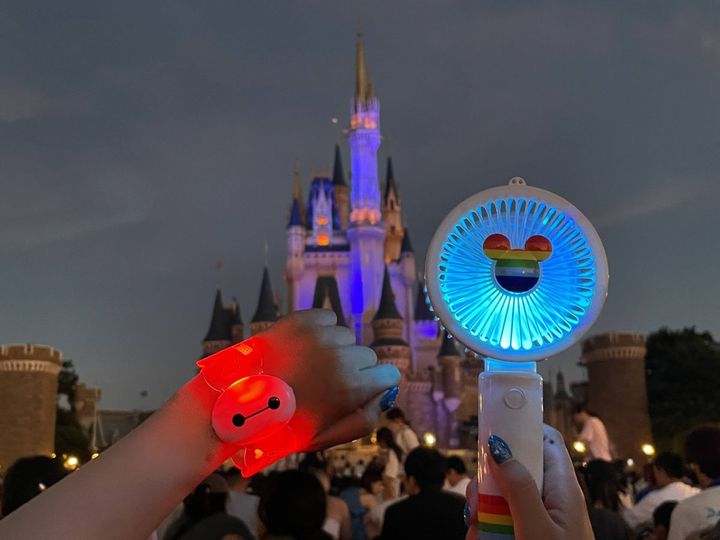 5色に光る「ファン」2400円は、日が沈むまでの暑さ対策にも大活躍。夜になって「東京ディズニーランド・エレクトリカルパレード・ドリームライツ」の鑑賞時に光らせてみました。パレードの光と相まって、なんだか自分もパレードに参加している気分に。何人かのキャラクターたちも気付いてくれて、楽しさがアップしました♪