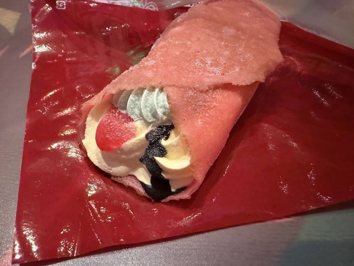 以前パークで販売していた人気フード「ストロベリー&ピスタチオクレープ」を基に、よりパークらしいスウィーツをと開発されたそう。持ちやすく、アイスクリームよりも溶けにくいので、食べ歩きにもおすすめです!